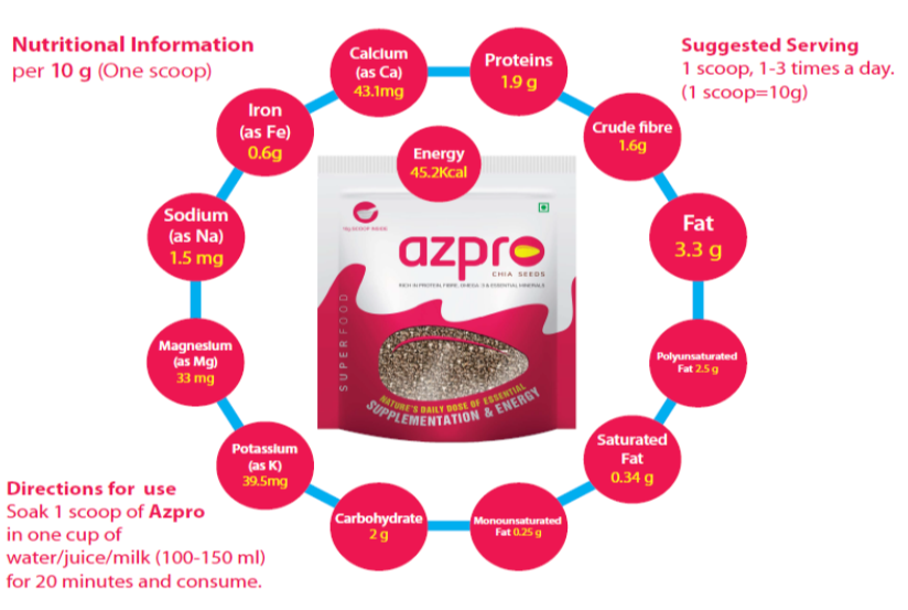 - The insoluble dietary fibre of chia is capable of retaining water several times of its weight and thus provides bulk and prolongs the gastro-intestinal transit time.